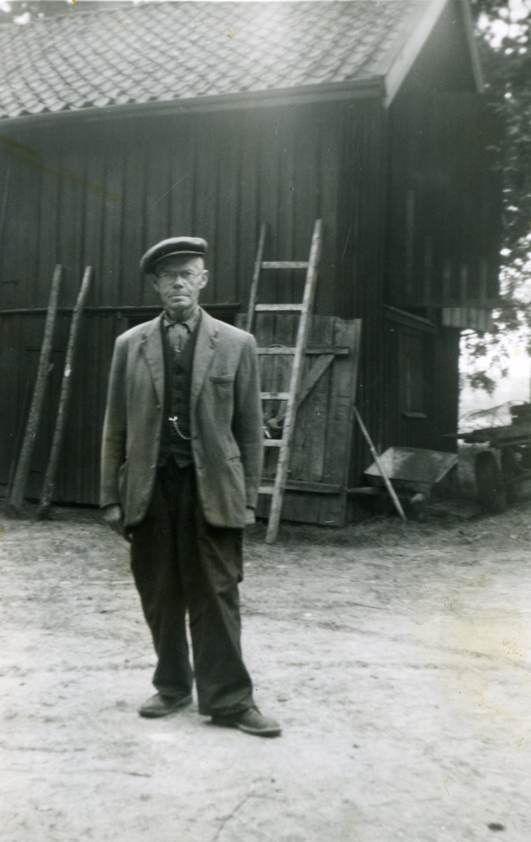 Stenarbetare Gustav "Lille Gustav" Larsson (1883 - 1963) vid Sporred 1:2 okänt årtal. Bodde med brodern i föräldrahemmet.