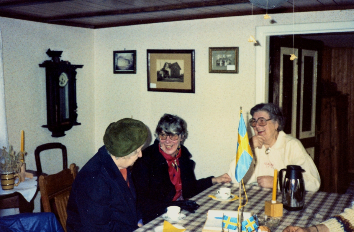 Söndagskaffe på Hembygdsgillet i Långåker 1:3, okänt årtal. Från vänster: okänd, okänd samt Inez Gustafsson, Livered, som bär Kålleredsdräkten. Den finns nu förvarad i hembygdsföreningens arkiv.