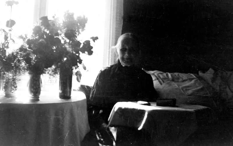 Josefina Mattsson (f. Bengtsdotter 1848 d. 1934) vid Tulebo Nordgård "Bernandes" "Mattssons" år 1933.