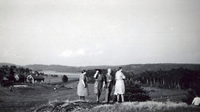 Från vänster: Mathilda Bengtsson (f. Apel 1894 d. 1968) , okänd, Thylander (från Risås backe) samt okänd. I bakgrunden till vänster ligger Hökekärr "Mackels" torp samt Hårsjön. Okänt årtal.