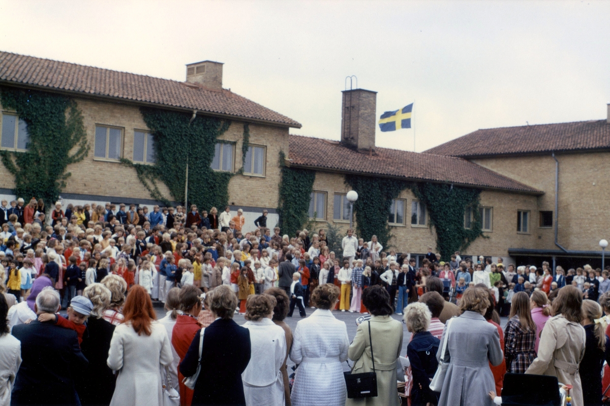 Examen och skolavslutning för elever på inre skolgården vid Brattåsskolan cirka 1970. Relaterat motiv: A1518.