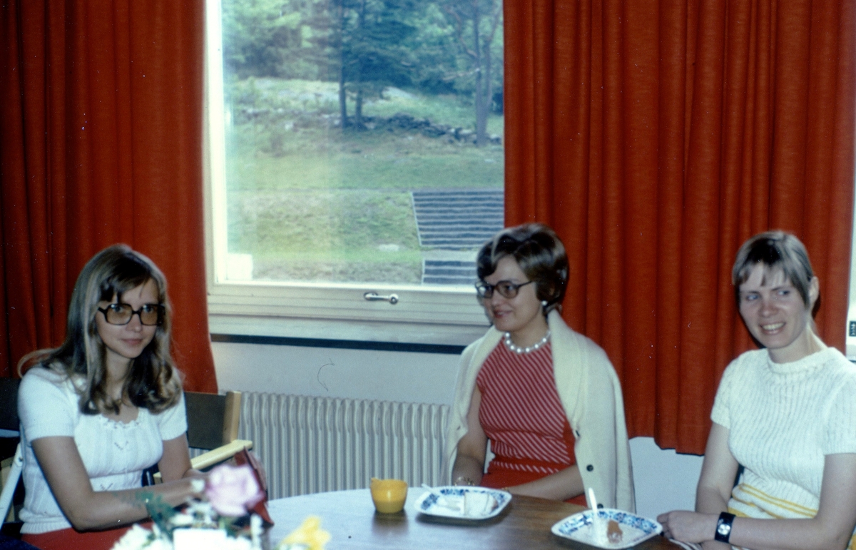 Från vänster ses: okänd, okänd samt Harriet Björck Tegard i Brattåsskolans lärarrum cirka 1970.