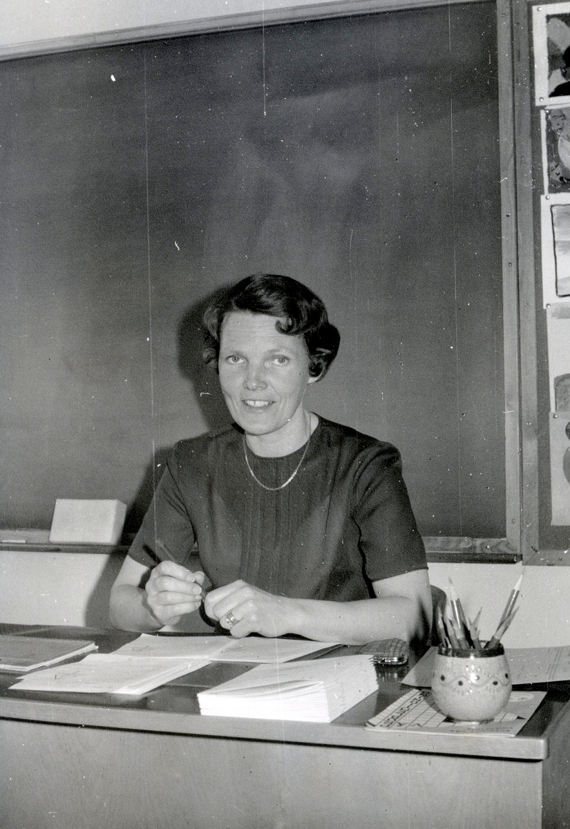 Ann-Marie Hillerström (1927 - 1997) sitter vid sin kateder i Kålleredskolan/Brattåsskolan okänt årtal. Hon arbetade som småskollärare i Kållered från 1962-.