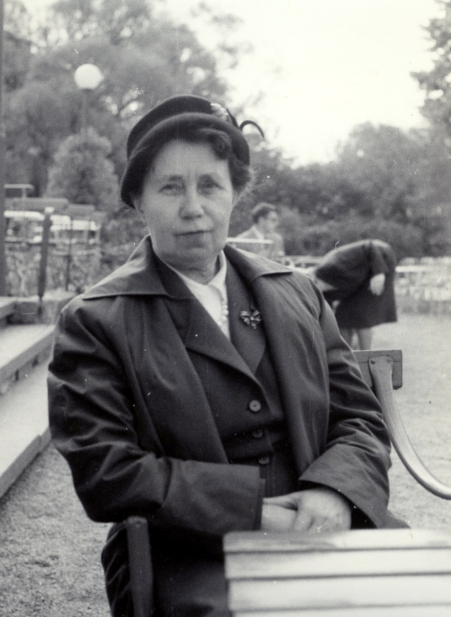Småskollärarinnan Margareta (Greta) Hernqvist (född 1895 i Göteborg - avliden 1984 i Kållered) på skolresa i Slottskogen cirka 1955. Hon arbetade som lärarinna 1914 - 1957. Relaterat motiv: A1532 samt A1534.