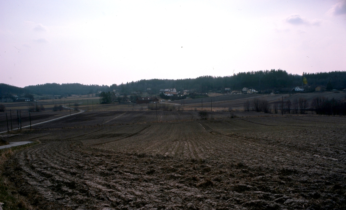 Vy över odlingsmark utefter Heljeredsvägen och Heljeredsgården år 1978. Flera gårdar samlade i Heljered. Sandsjöbacka naturreservat ses i bakgrunden.