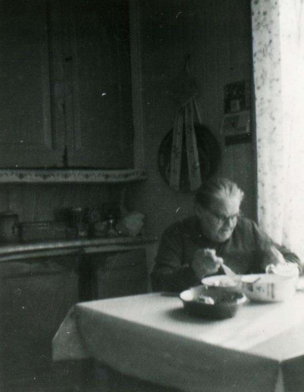 Augusta Karlsson f. 1869 i Moholm d. 1957, sitter i sitt kök och äter frukostgröten.