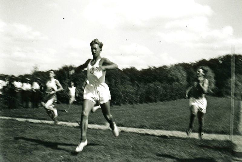 Sven Kristensson f. 1920 d. 2008, son till Ivar och Ester Kristensson, Kyrkbacken, vinner 100 m. för Tulebo i tävling mot Stretered.