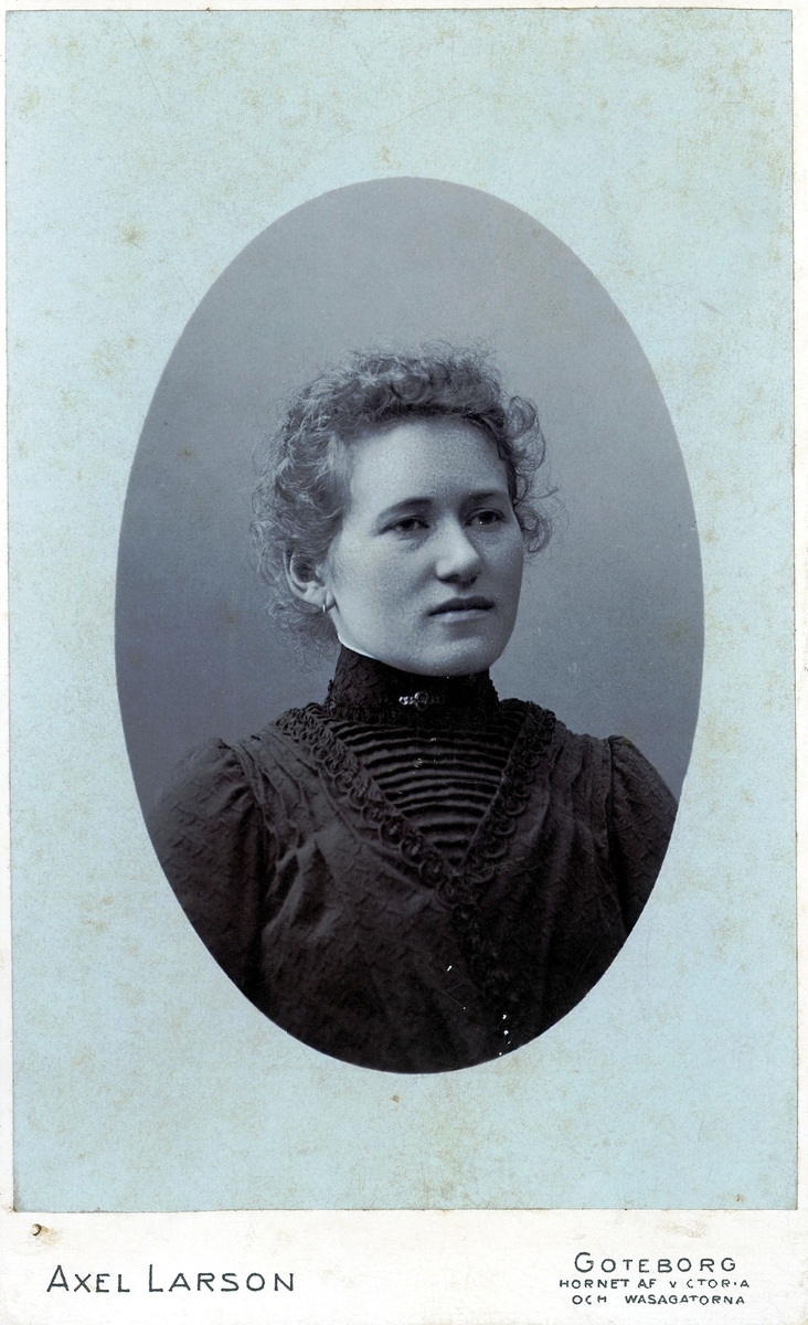 Studioporträtt av Alma Abrahamsson, född 1879 i Backa, Hisingen. Död 1957 i Vommedal. Gift med Oskar Abrahamsson. De bodde på "Abrahams" Vommedal Västergård. För mer information: läs Hembygdsskrift nr 13.