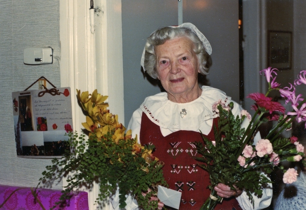 Signe Fredriksson (1901 - 1992) med buketter i händerna. Hon bodde i "Målarns" i Livered, 1981.