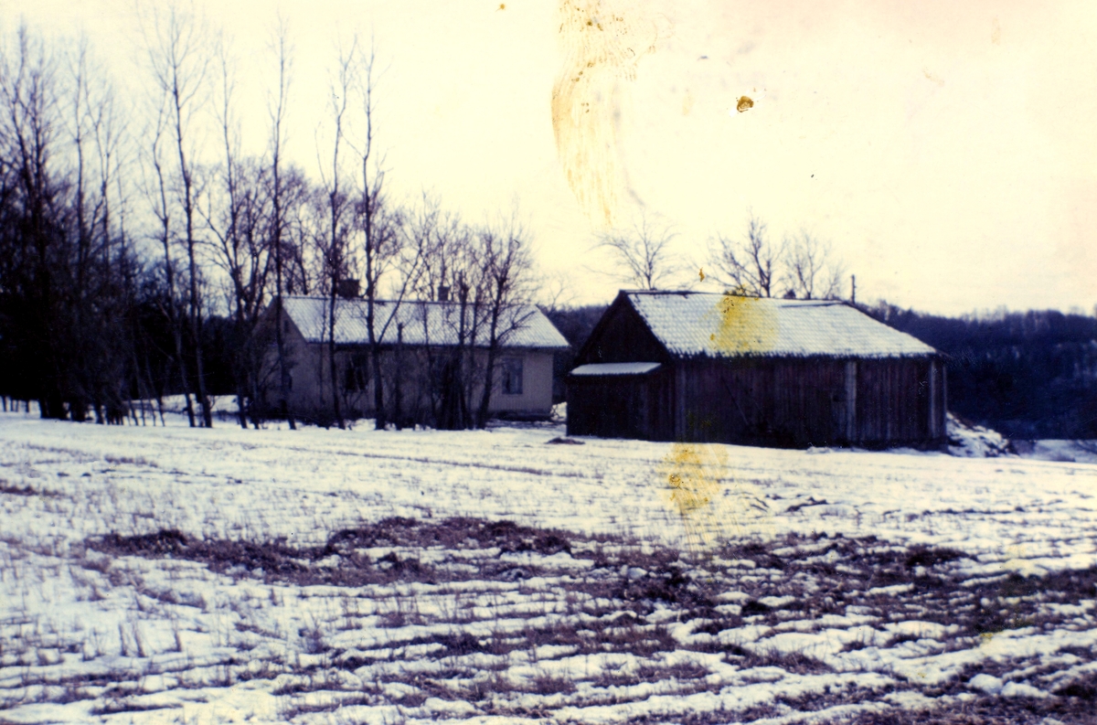 Kålleredgården "Emils", 1960-tal. Här ligger idag husen på Hedbäcksvägen. Fotografiet är kladdigt.