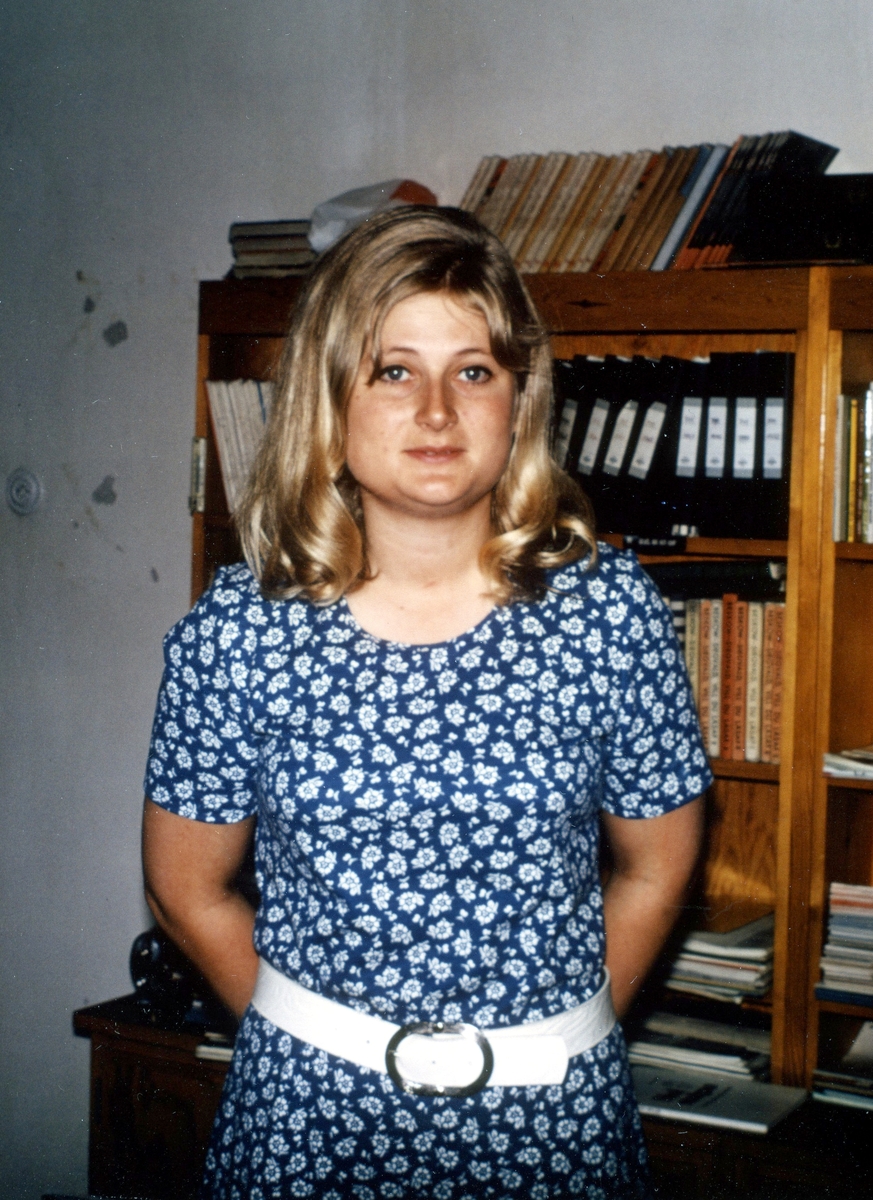 Lärarinnan Gunnel Öwrin står i lärarrummet på Brattåsskolan, okänt årtal. I bakgrunden finns böcker och pärmar i hyllor.