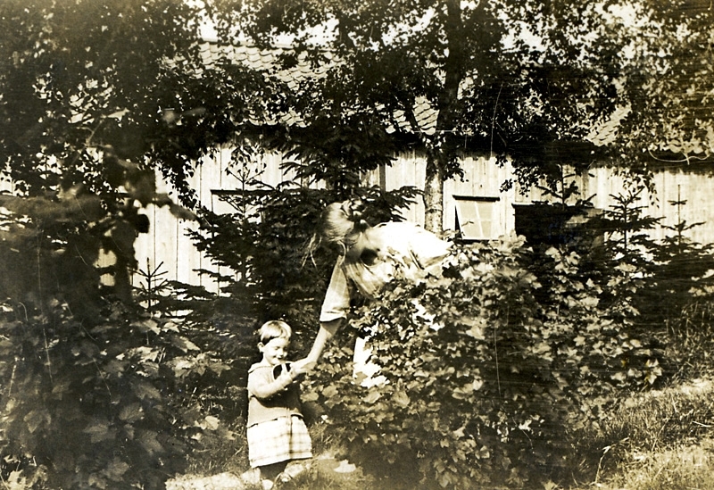 Vommedal Västergård "Hanses" cirka 1915. Sommargäster (ett barn och en kvinna) står utanför ladugården som ses i bakgrunden.