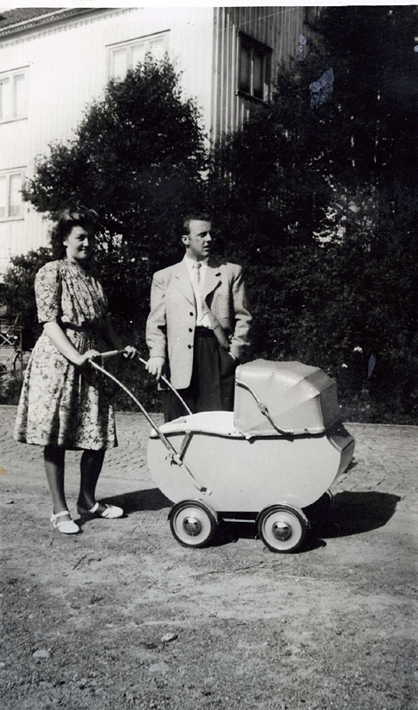 Inger och Karl Erik Persson med dottern Gullevi f. 1945 i barnvagnen.
