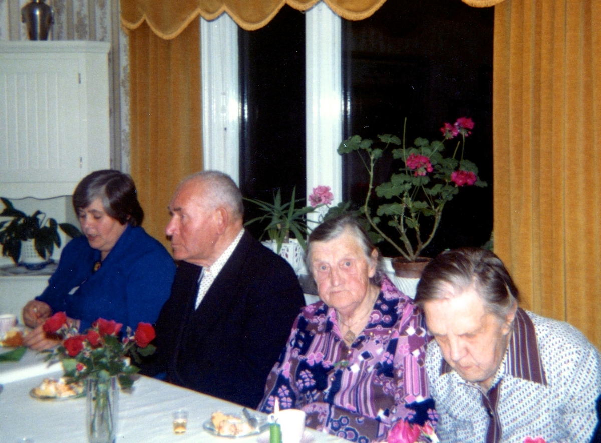 Anhörigträff på Brattåshemmet 1979. Från vänster ses Nina Babkin, fadern Kondratij Krivtsov, okänd kvinna samt Larsson (Helgered).