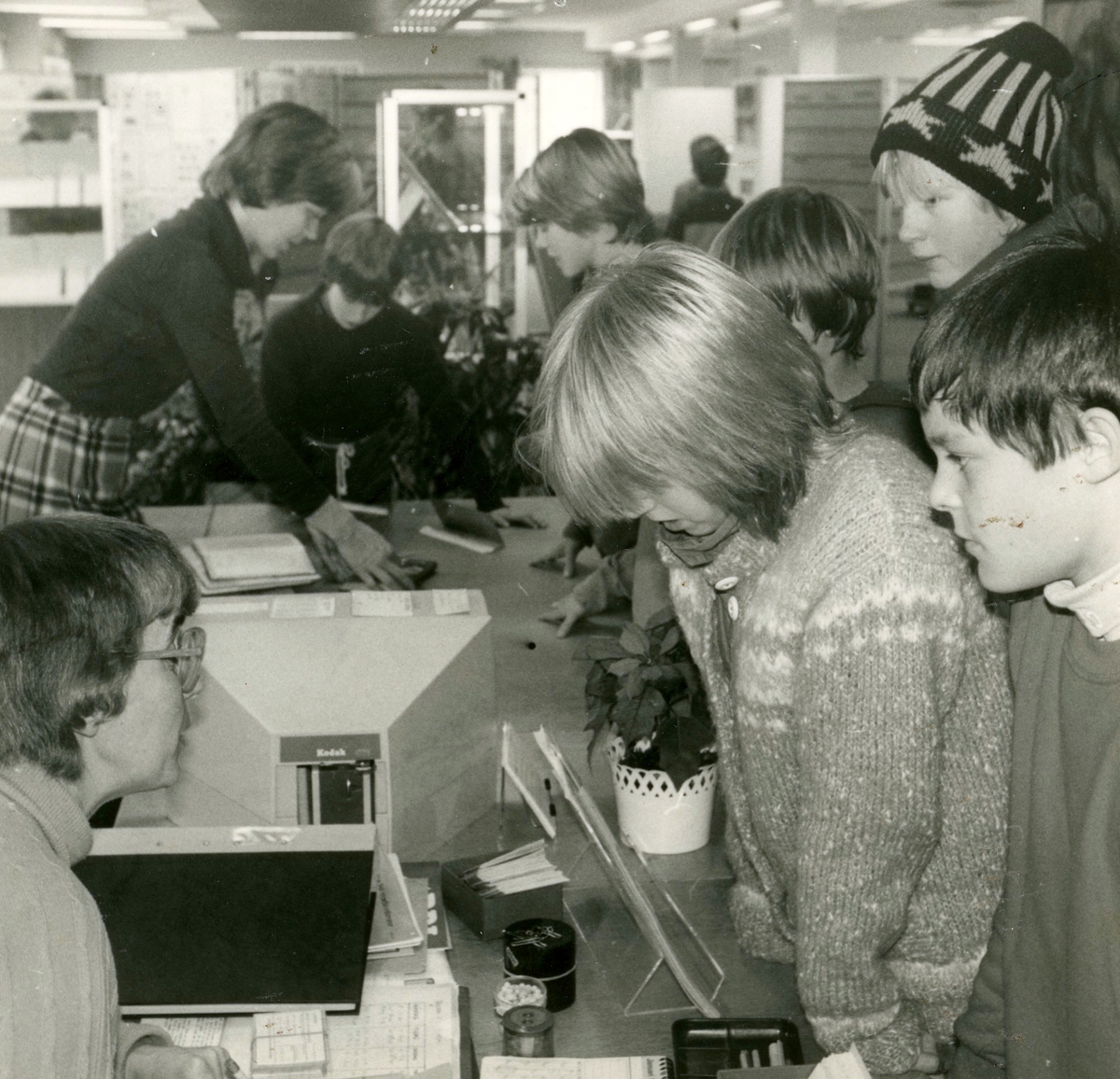 Biblioteksassistent Ingrid Hansson (ståendes till vänster) vid utlåningsdisken på Kållereds bibliotek 1980-tal.
