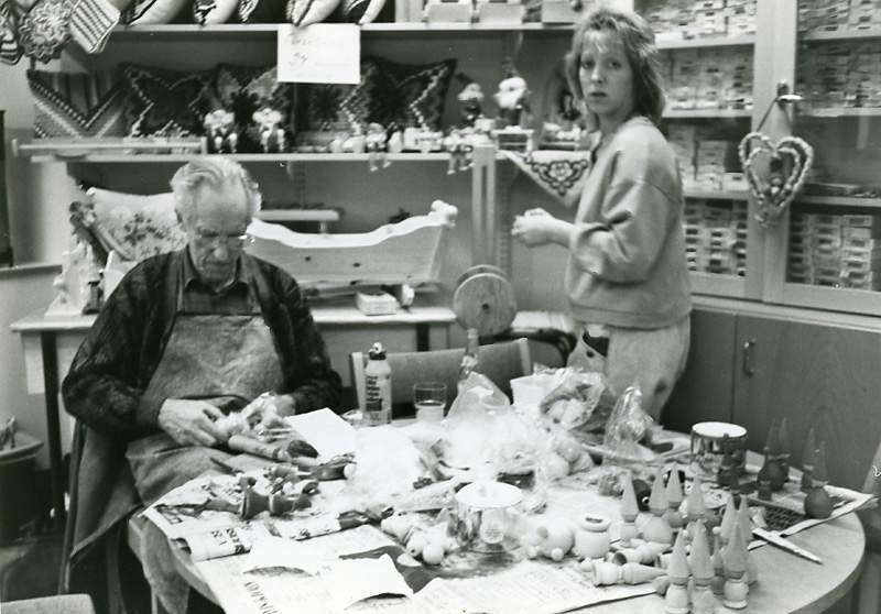 Nils Dahl (1922 - 1993) och vårdbiträde Susanne Olsen i Brattåsgårdens hobbylokal cirka 1988-89.