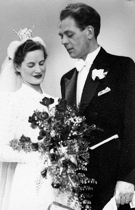 Bröllop i Kållereds kyrka 19/1 1952 mellan Elin Josefsson, Äpplekullen (1919 - 1994) och Helge Ekström (1919 - 1991). Bruden använder Kållered kyrkas brudkrona. Relaterat motiv: A0095.