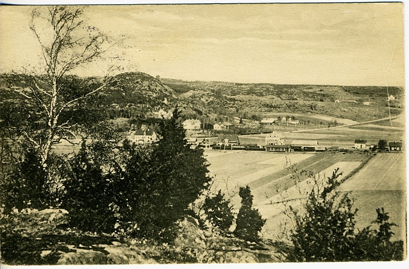 Vykort, foto taget från Ramnberget över Kärret. Stationen till höger och Vommedalsbacken.