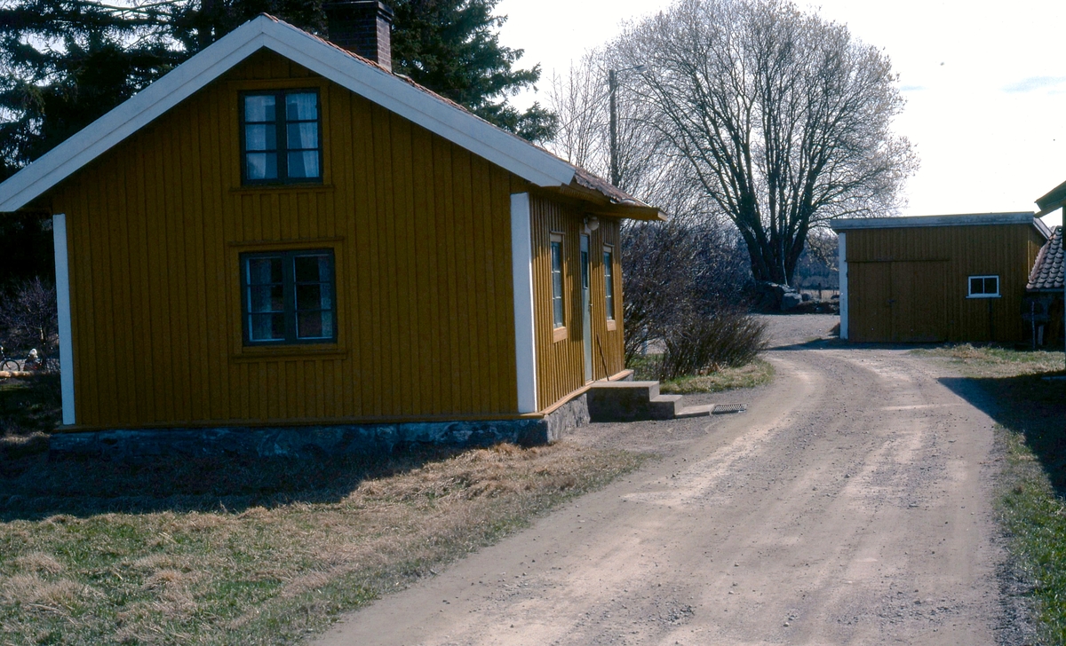 Tulebo Nordgård 1:6 "Mossen", "Helgessons" år 1980. Boningshus från cirka 1880. Uthus och smedja ligger till höger. Vägen är Tuleboängsväg. Huset revs cirka år 2000.