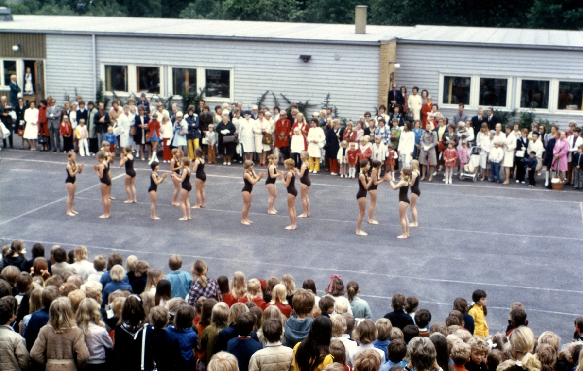 Examen och skolavslutning för elever på inre skolgården vid Brattåsskolan cirka 1970. Några elever i svarta gympadräkter gör en dansuppvisning.