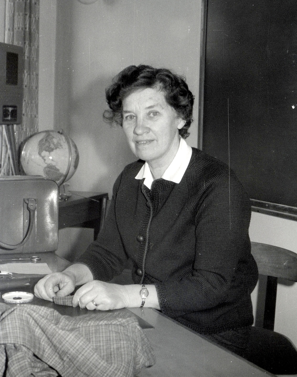 Rut Fonell (1903-2005) i Kålleredskolan/Brattåsskolan cirka 1965. Hon arbetade som handarbetslärarinna i Kållered 1949-1968.