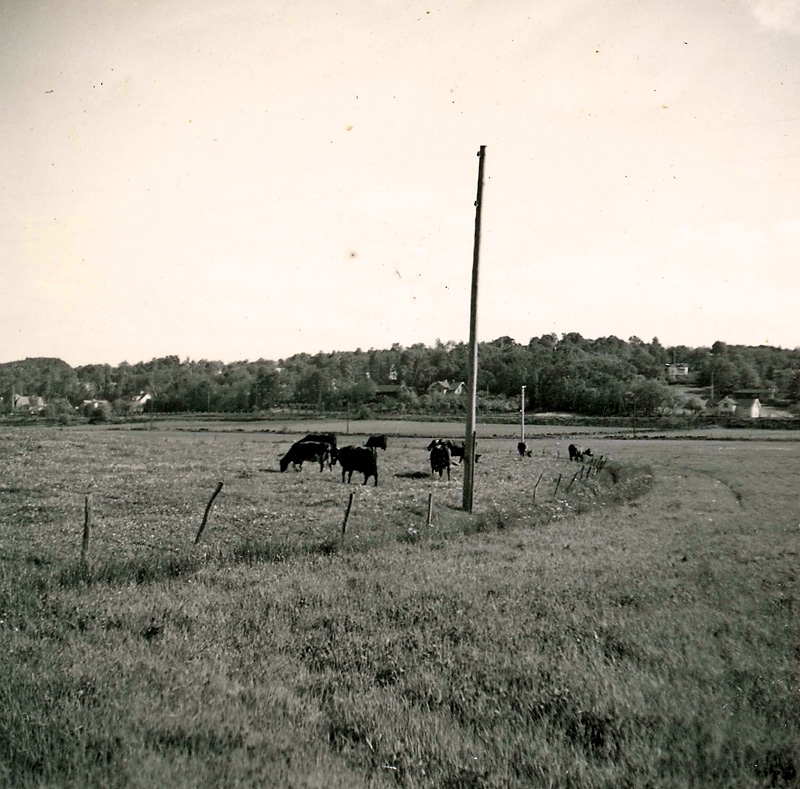 Ekans åkrar, år 1953. I bakgrunden ses Västkustbanan, Gamla Riksvägen och hus i Kyrkbacken. Mitt i bilden (bakom elstolpen) anas Nygård Kållered Stom.