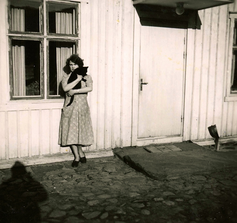 Eva Svensson Johansson, dotter till ägaren Rolf Svensson och katten Nalle är utanför Ekan 1:1 år 1953.