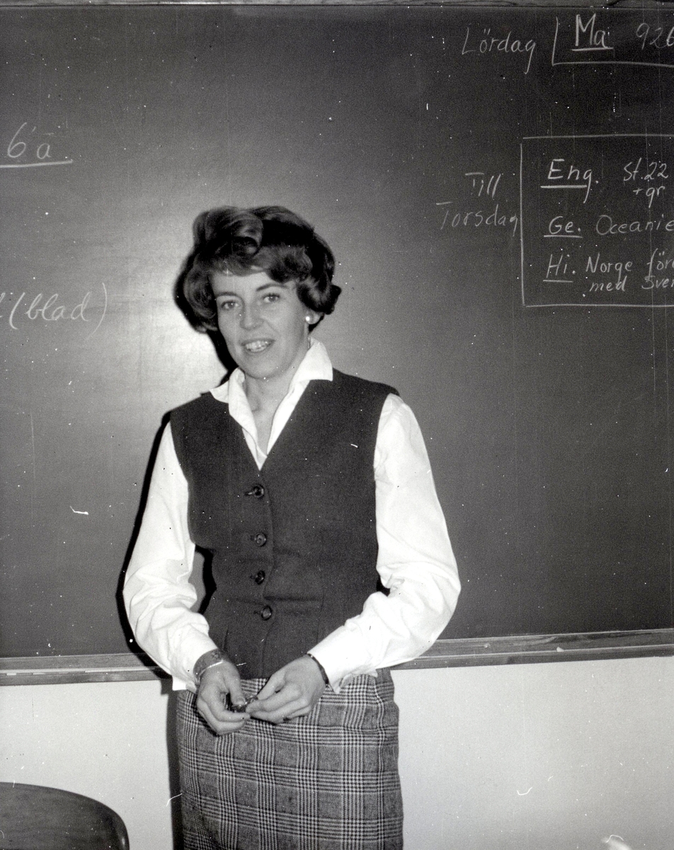 Birgitta Dalstad Persson (folkskollärare i Kållered 1957-1966) i Kålleredsskolan (senare Brattåsskolan), cirka 1965. I bakgrunden ses svarta tavlan.