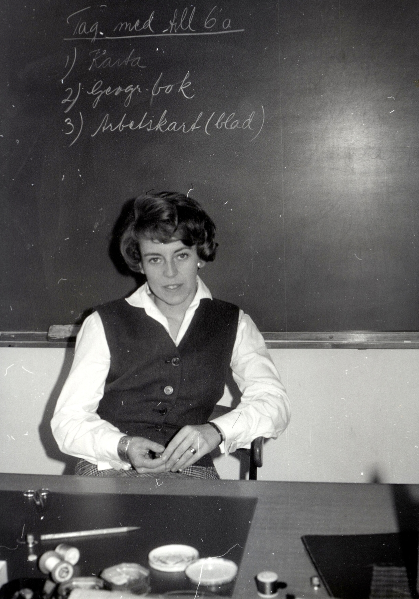 Birgitta Dalstad Persson sitter vid katedern (folkskollärare i Kållered 1957-1966) i Kålleredsskolan (senare Brattåsskolan), cirka 1965. I bakgrunden ses svarta tavlan.