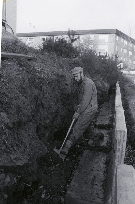 Arne Gustafsson, pastor och i bakgrunden syns hyreshusen, Labackavägen 34.