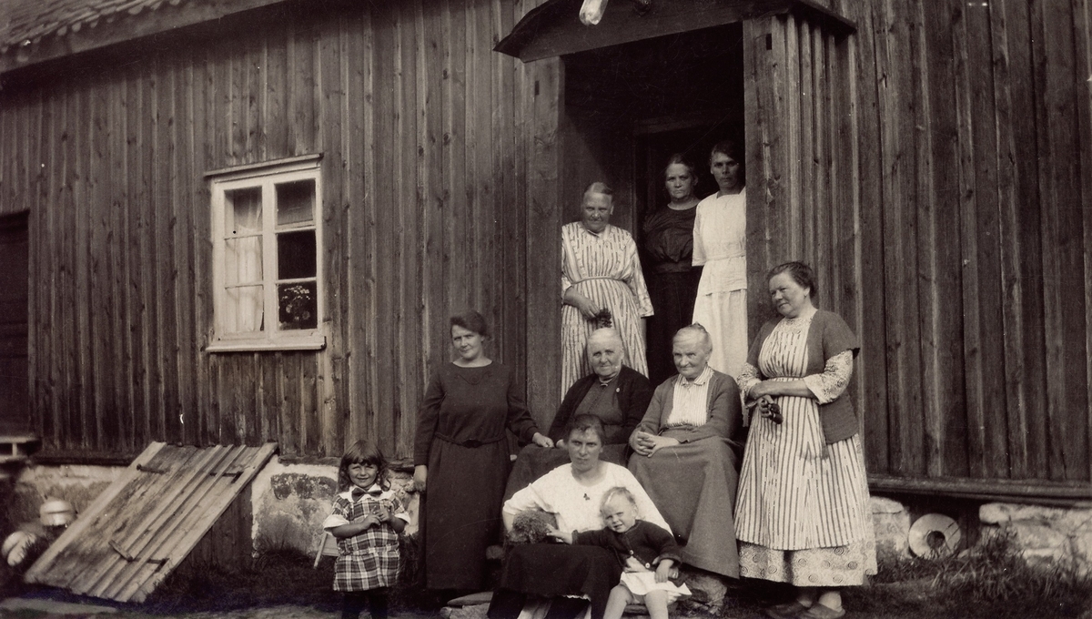 Heljered Sörgård "Skräddarns" cirka 1920. Stående överst till vänster: Sofia Andersson. Stående på mellanraden längst till höger: Emma Andersson. Stående längst till vänster: grannen (barn) Åke Johansson (född 1918).