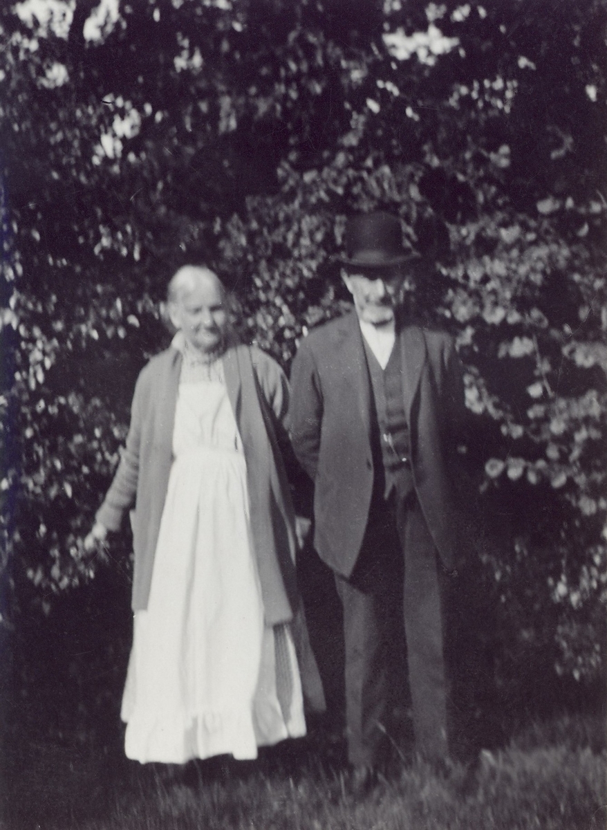 Heljered Sörgård "Skräddarns" cirka 1910. Brita Kristina Johansdotter (född 1835 i Torrekulla, död 1923 i Heljered) med maken skräddaren Magnus August Andreasson (född 1832 i Fjärås, död 1913 i Heljered).
