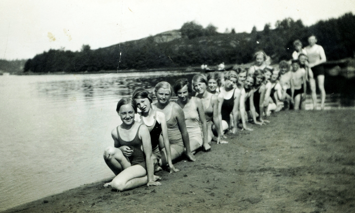 Baddräktsklädda ungdomar vid strandkanten. Från vänster: Britt Smitt (1922 - , gift Pettersson) samt Rut Johansson, Vommedal (1921 - 1971, gift Sandberg).