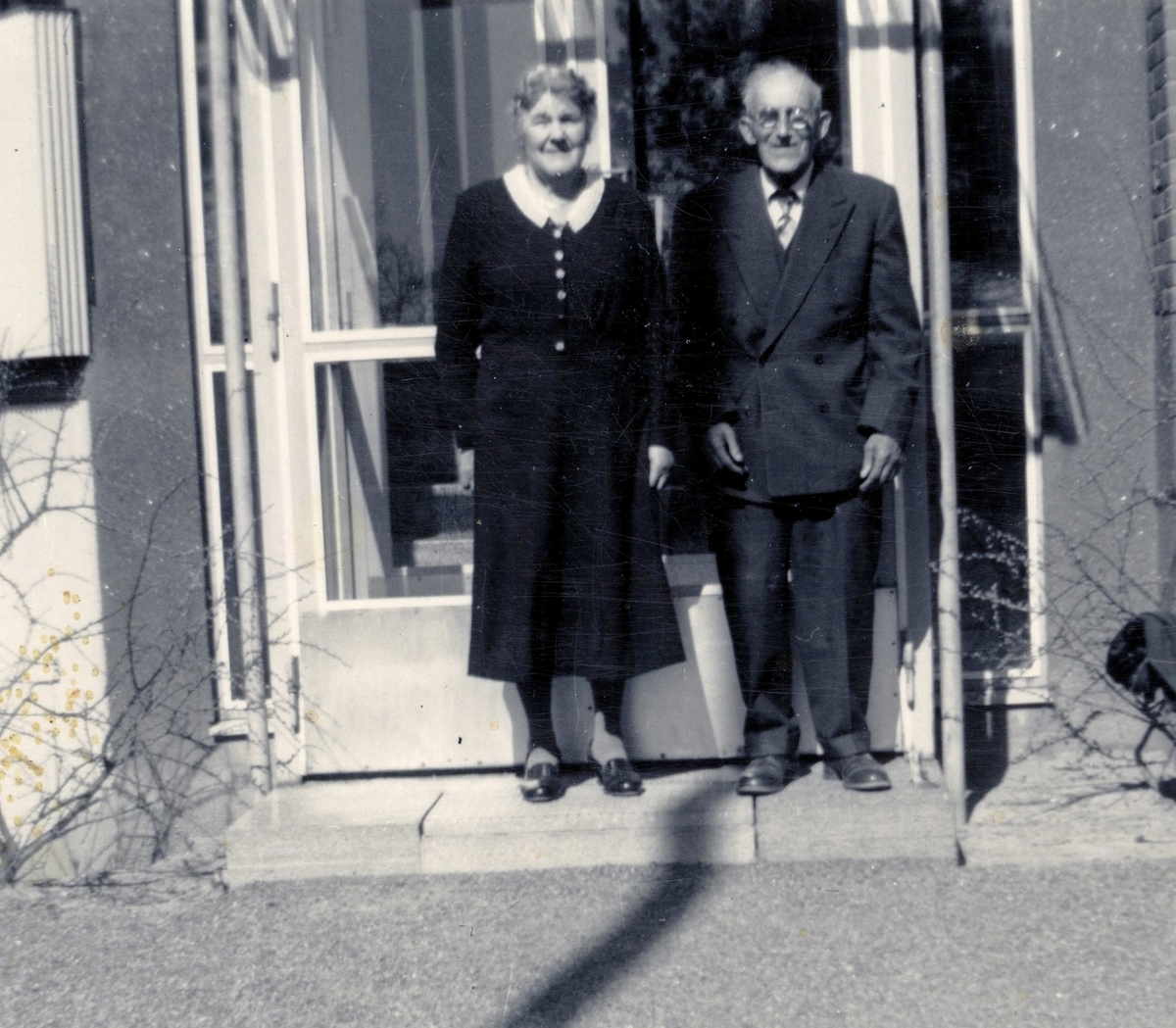 Robert Pettersson (1886 - 1968) uppvaktas på födelsedagen av sin syster (uppgift saknas) som står till vänster. De står utanför Brattåshemmets entré 21/4 1960. Han arbetade som dräng på Ekans gård.