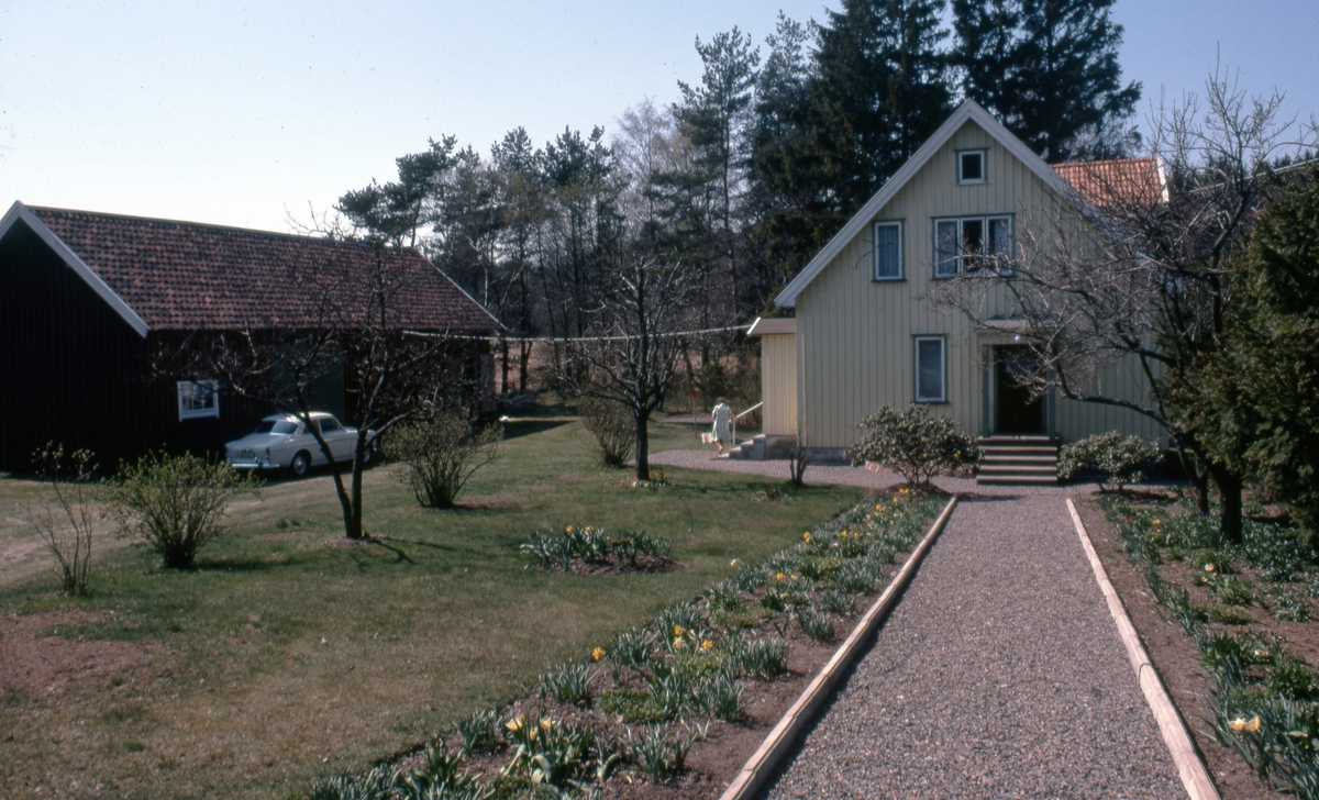 Ombyggt gårdshus från 1880 - 1900-talet, Labacka 1:6 "Eriks", år 1978. En vit Amazon står parkerad utanför ladan.