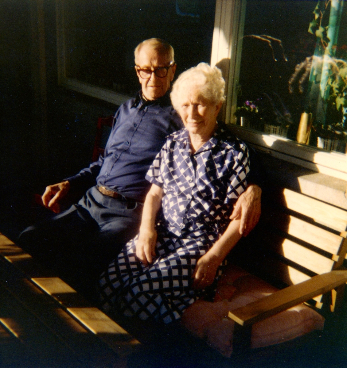 Skräddaren Per Pettersson (1896 - 1981) och sömmerskan Agnes Ekstedt (1898 - 1984) sitter på en parkbänk utanför Brattåshemmet våren 1979.