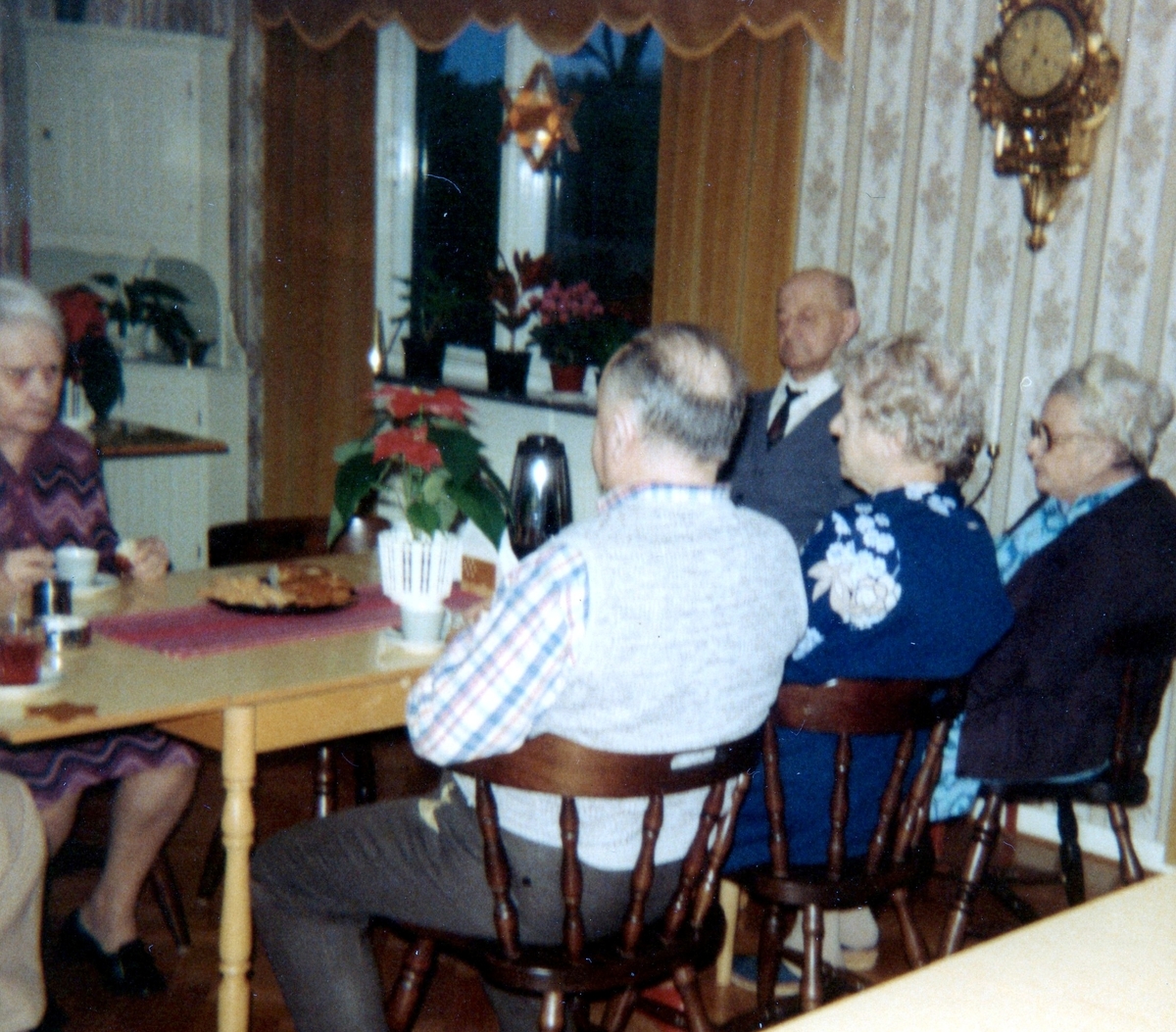 Fem äldre personer sitter runt ett bord i dagrummet/matsalen på Brattåshemmet hösten 1979. Mannen i mitten med slips är Anselm Zackrisson (1900 - 1987), övriga är okända.