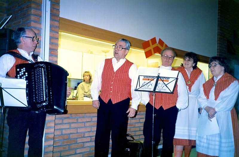 Musik och sång från IOGT/NTO Mölndal i Brattåsgårdens matsal år 1986. Från vänster: Knut Andersson, Mölndal, dragspel, P-O Jacobsson, Mölndal, Bosse Andersson, Mölndal, Ulla-Britt Andersson, Mölndal samt Norma Andersson, Mölndal. I bakgrunden ses vårdbiträde Susanne Olsson.