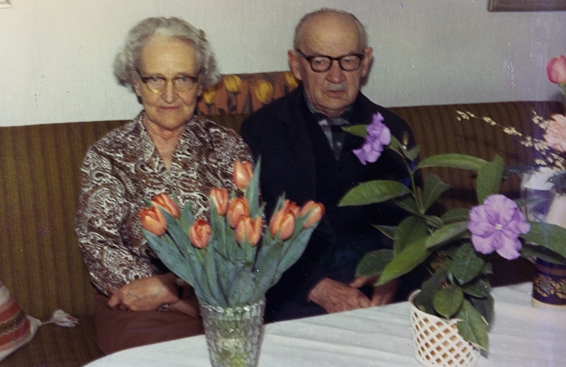 Födelsedag i april början av 1970-talet på Vommedal Östergård 2:41 "Olas", Vita huset Streteredsvägen 21 B. Makarna Judit Johansson (1893 - 1973) Gustav Johansson (1886 - 1977) som både var lantbrukare och smed.