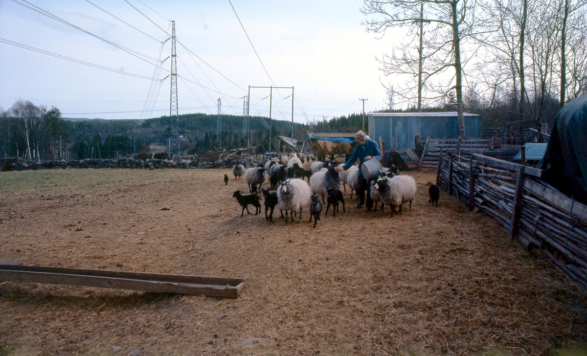 En person utfordrar får i en hage på "Lessbacke" Sagered 1:4 år 1980. Elledningar ses till vänster. "Lessbacke" var ett torp under Sagered som låg på gränsen till Lindome. Namnet kommer av Ledet Ledsbacke.