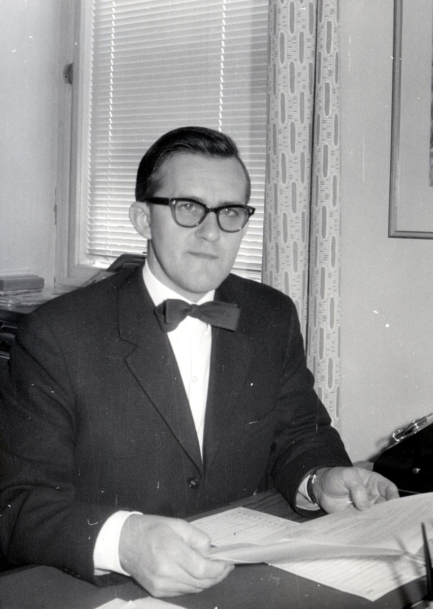 Gunnar Hillerström (1923-1997) i Kålleredskolan/Brattåsskolan cirka 1960. Han arbetade som: Tillsynslärare 1955-1958, Skolsekreterare 1956-1958, Rektor tillika skolchef 1958-1970. Från 1971 rektor i Mölndal på bl.a Ekenskolan.