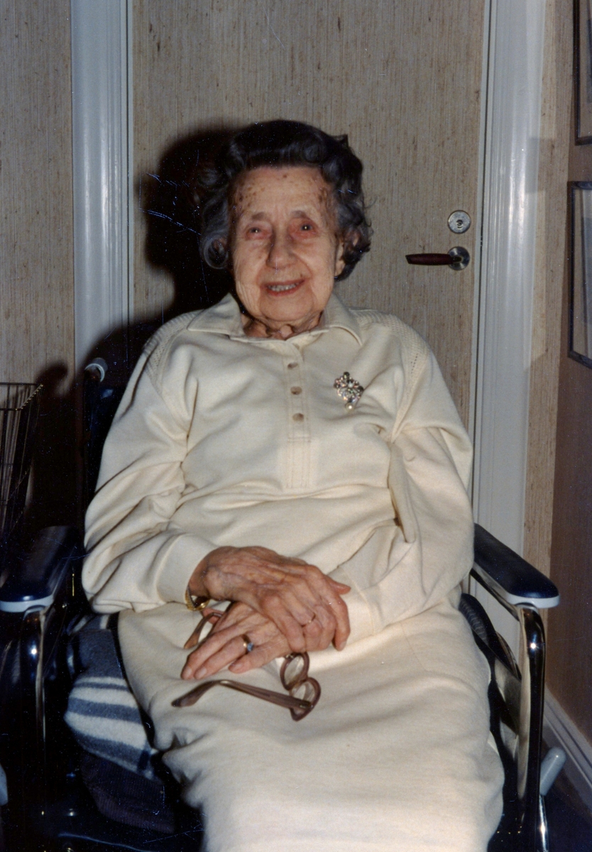 Margareta (Greta) Hernqvist (född 1895 i Göteborg - avliden 1984 i Kållered) sittandes i rullstol i Kålleredskolan i Livered cirka 1980. Hon arbetade som lärarinna 1914 - 1957. Relaterat motiv: A1533.