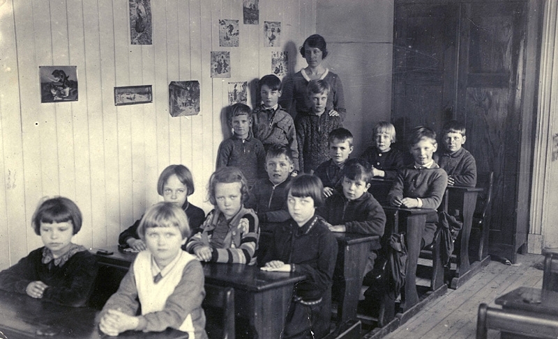Främre raden till hö. Ingalill Hansson, andra raden i mitten Sonja Eriksson, Hallen, stående främst Rolf Johansson Jägrud, Heljered, sittande till vä. på näst sista raden ? Pettersson, Högen, längst bak Greta Alm Andersson.