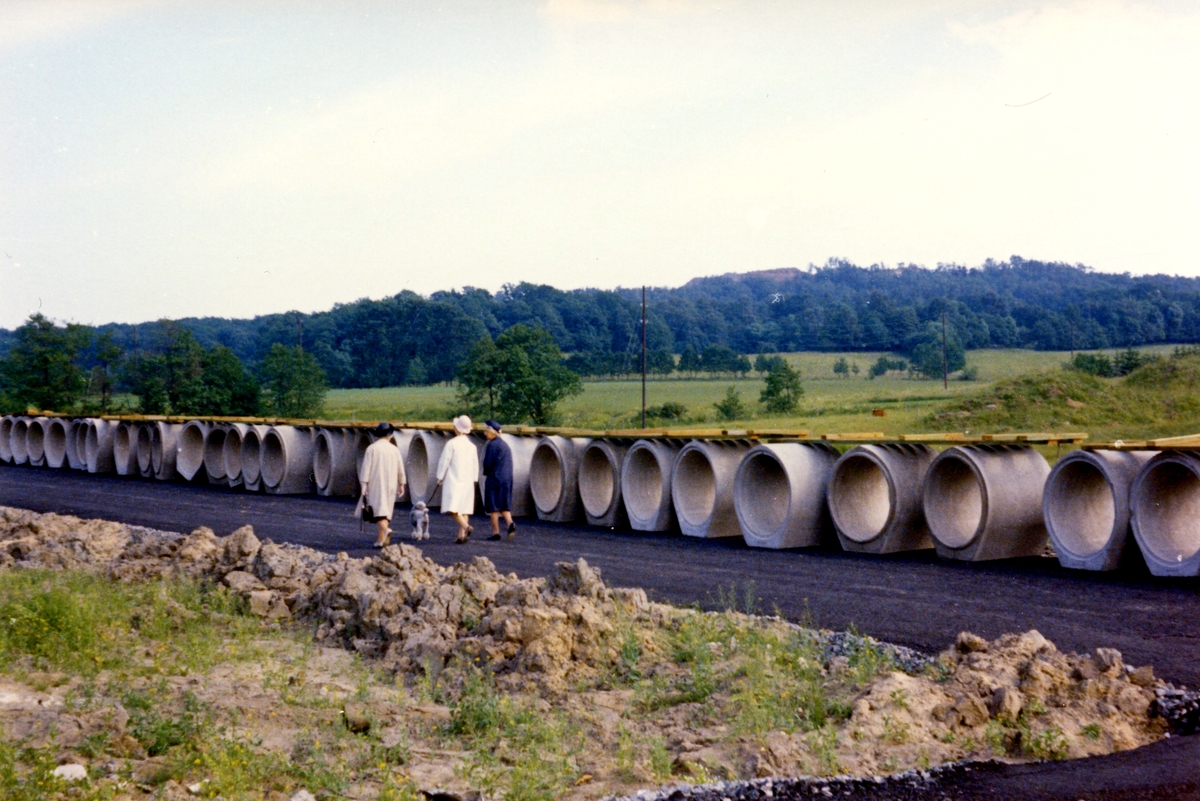 Tre kvinnor och en hund promenerar på Östra Kyrkvägen år 1966. De går på en gångväg nedanför nuvarande Östergårdsskolan (Vommedal Östergård). Flertalet cementrör ligger uppradade utefter vägen. HSB skall börja bygga. I bakgrunden ses åkermark, natur och Sagåsen.
