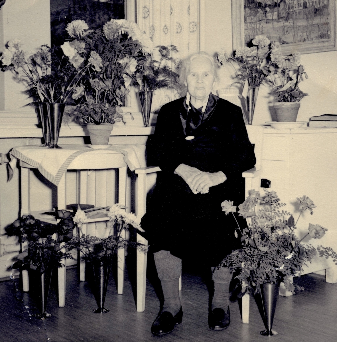 Hulda Hansson (1876 - 1975) blir uppvaktad med blommor, här på ett sjukhem okänt årtal. Hon arbetade som hushållerska hos konsul Kindal på Vasagatan i Göteborg. Han ägde Gumperts bokhandel (se Hembygdsskrift nr 13). Efter pensioneringen bosatte hon sig i sitt föräldrahem Vommedal Västergård "Sväs", där nu Brattåsgården ligger. Relaterat motiv: A1390.