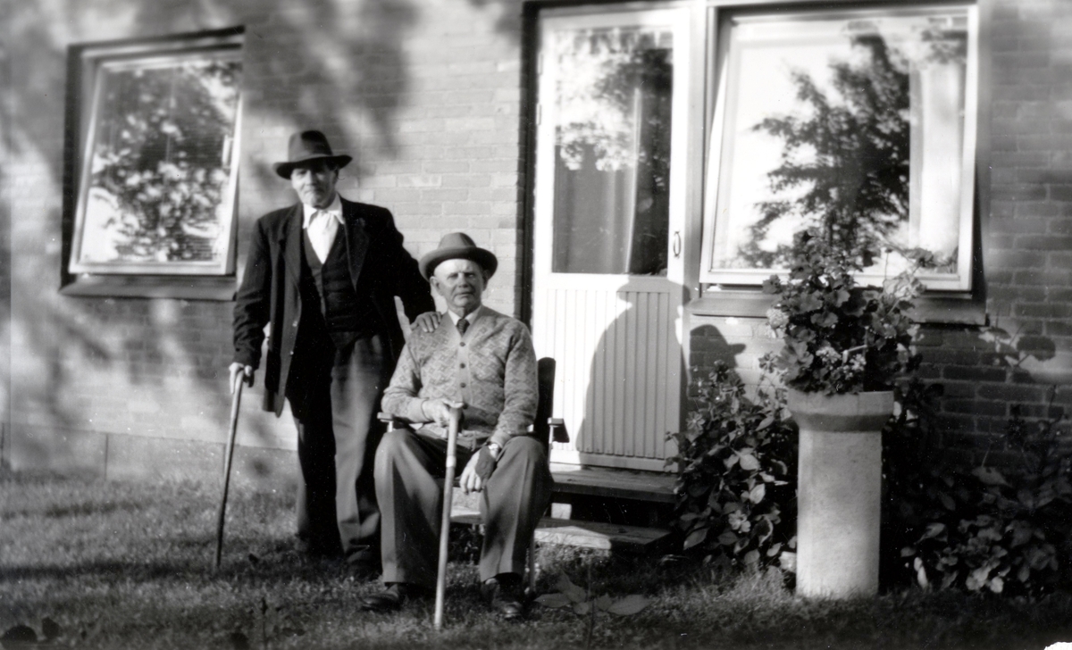Två män utanför Brattåshemmet 1955 - 58. Till vänster står Alfred Johansson (1876 - 1964). Han arbetade som dräng på Högens gård. Till höger sitter Otto Emil Ottosson "Starbäck" (född i Munkedalstrakten 1881 - 1958). Han kallade sig Starbäck.