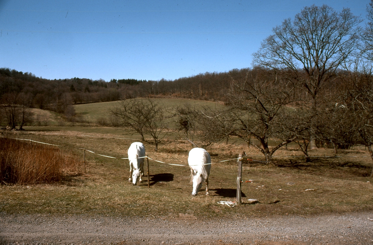 Två vita hästar som betar på Johan Gustafssons gamla ägor Tollered 1:2 (idag: Tållered 1:8) år 1978.