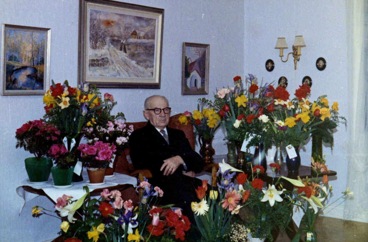 Gustav E Johansson (1886 - 1977) uppvaktas på 80-årsdagen 1966-04-05 i salen på Vommedal Östergård 2:41 "Olas" (nu: Streteredsvägen 21B). Gustav var både bonde och smed. Relaterade motiv: A1851 och A1852.