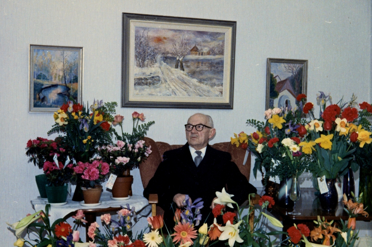 Gustav E Johansson (1886 - 1977) uppvaktas på 80-årsdagen 1966-04-05 i salen på Vommedal Östergård 2:41 "Olas" (nu: Streteredsvägen 21B). Gustav var både bonde och smed. Relaterade motiv: A1851 och A1852.
