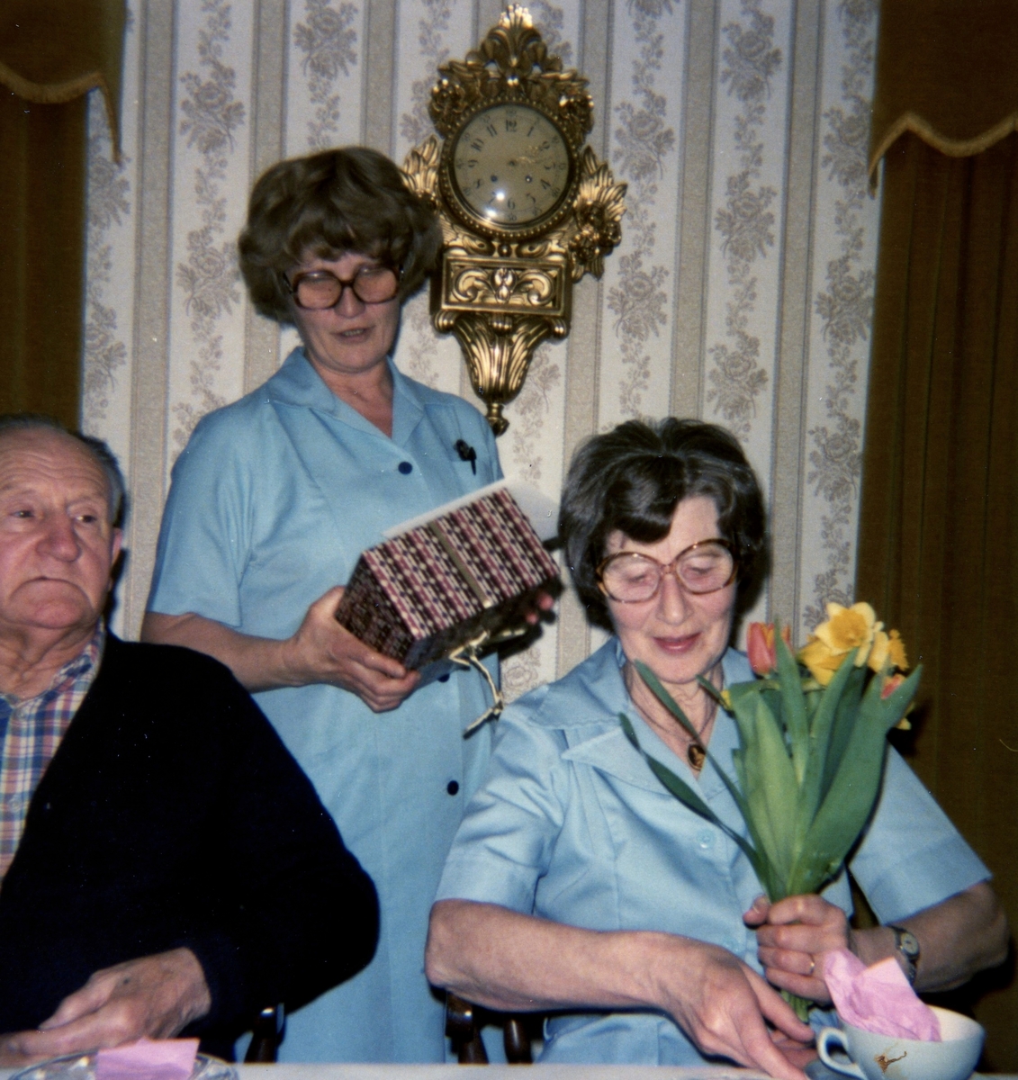 Avtackning av vårdbiträde Elsa Nilsson i Brattåshemmets matsal, maj 1979. Från vänster: Okänd man, föreståndare Aina Ekstedt samt Elsa Nilsson. På väggen i bakgrunden hänger en guldpendyl. Relaterade motiv: A1846 och A1855.